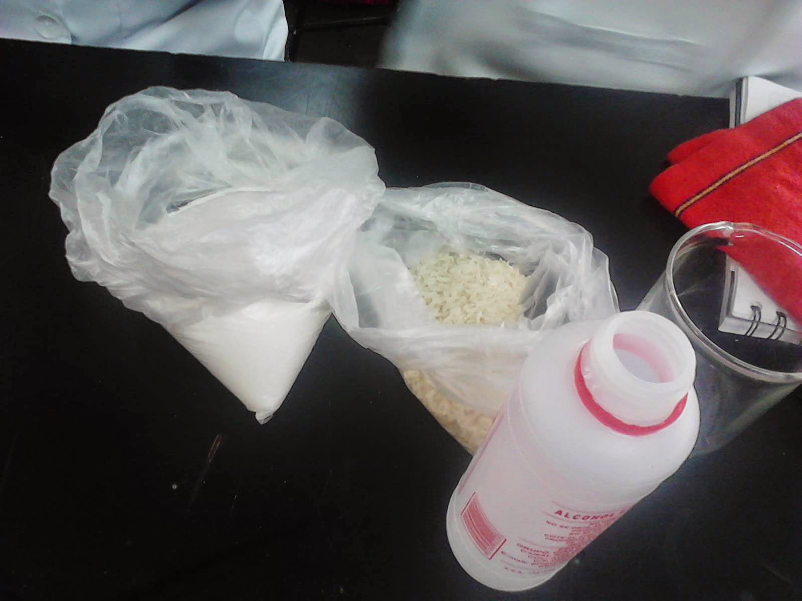 materiales: azúcar, alcohol, arroz, 2 vasos de precipitados y una coladera.